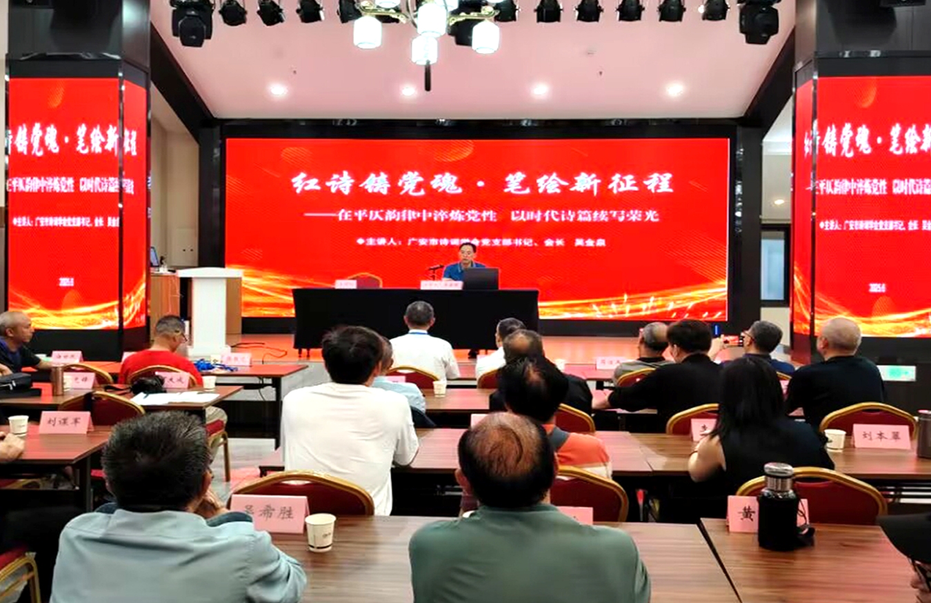 广安市诗词学会党支部书记、会长吴金泉正在以“红诗铸党魂•笔会新征程 ——在平仄韵律中淬炼党性 以时代诗篇续写荣光” 为主题,开展微党课分享现场。
