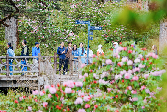 杜鹃珙桐、森林瀑布、徒步挑战、绿野仙踪……在瓦屋山景区,只见游客或漫步在平顶栈道上赏漫山繁花,或参与全山徒步挑战赛赢取奖牌,或沉醉在万亩原始森林里与负氧离子共舞,或拍照打卡定格美好瞬间。“在很多地方都徒过步,但来到瓦屋山,感觉风景特别美。一路有珙桐、杜鹃,非常漂亮,一边欣赏美景一边运动,这种体验非常棒,非常建议大家一起来瓦屋山徒步。”游客周豪说。