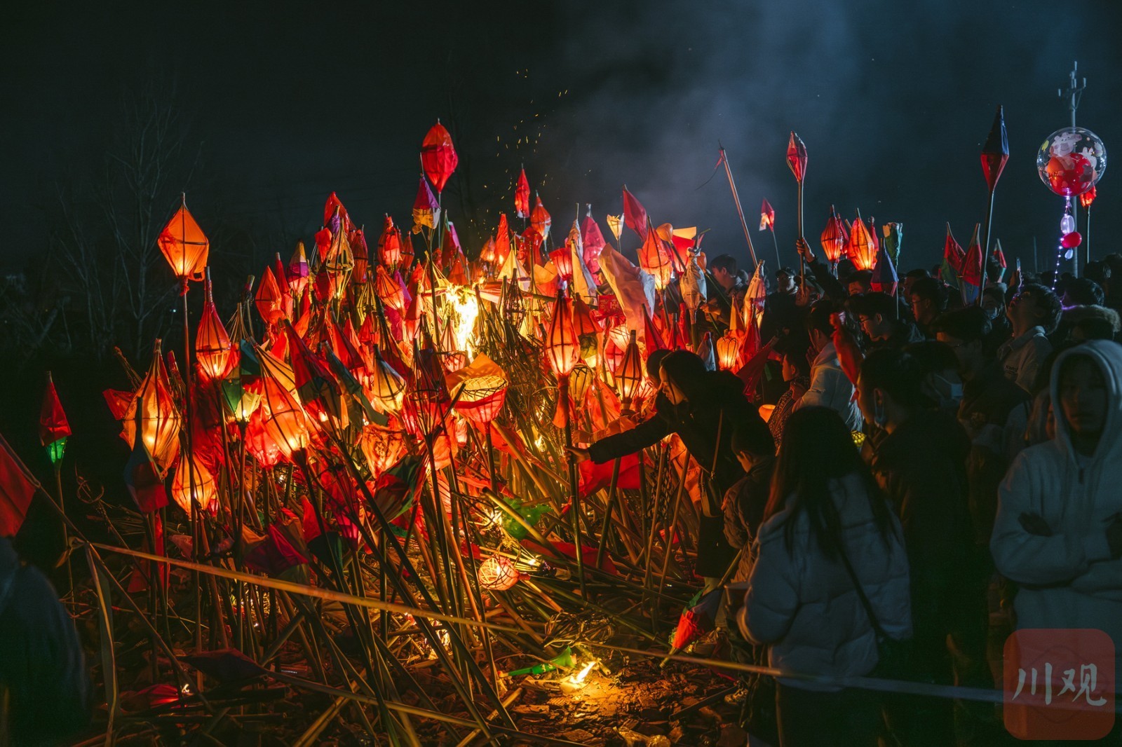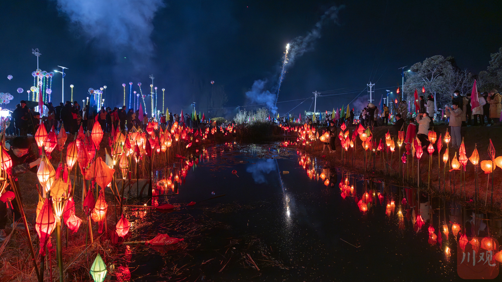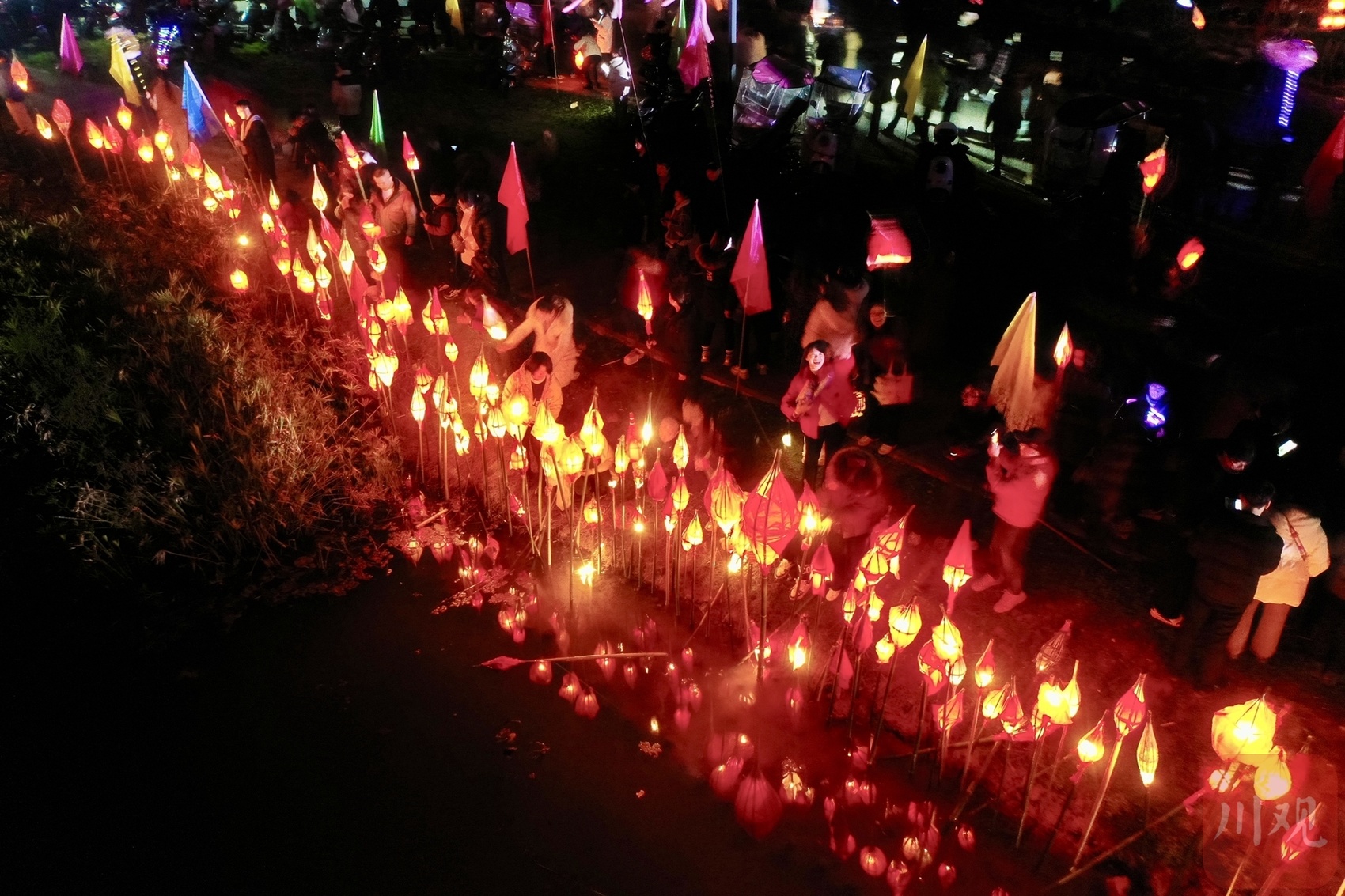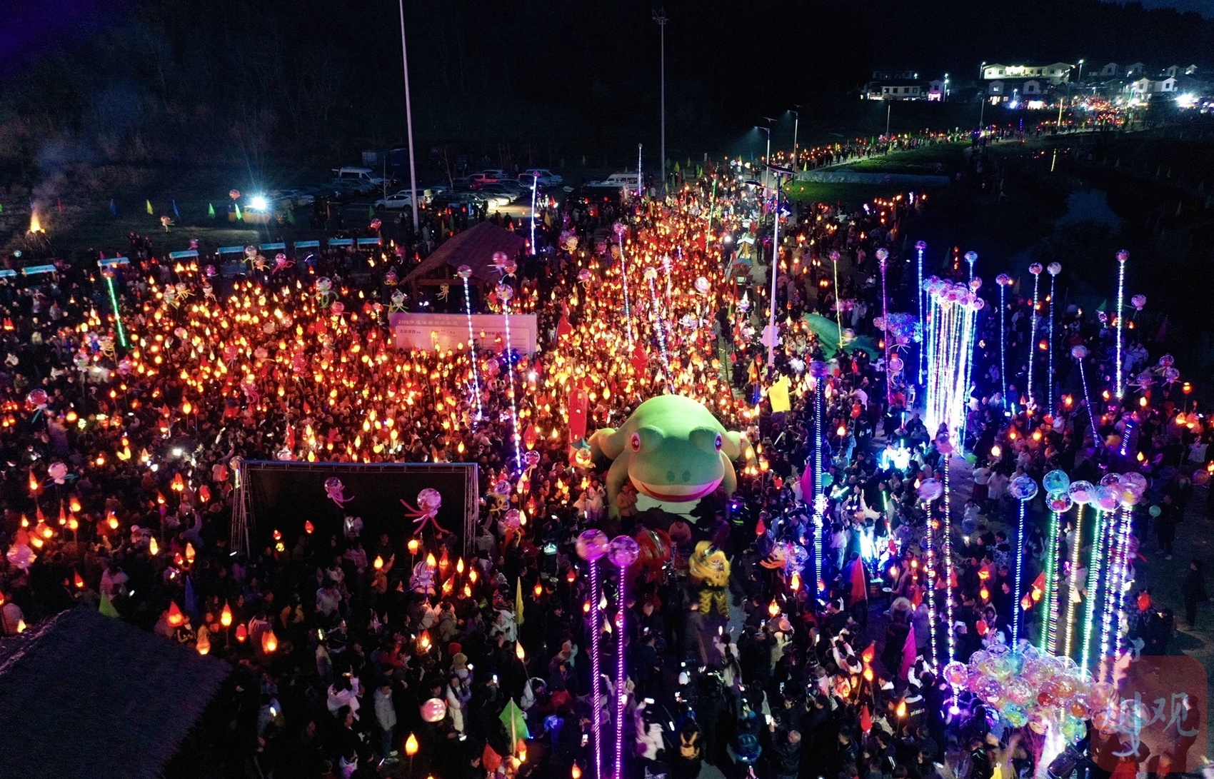 2月11日,万余市民和游客共聚遂宁市蓬溪县文井镇白鹤林村,参加一年一度在这里举行的“送蛴蟆”民俗文化活动。与此同时,南充多地也同样举行了规模盛大的“送蛴蟆” 祈福活动。大人小孩成群结队举着蛴蟆灯,唱着“送蛴蟆”歌谣,将“蛴蟆”插在田间地头送走,祈求新的一年,远离疾病、阖家幸福,五谷丰登、六畜兴旺。