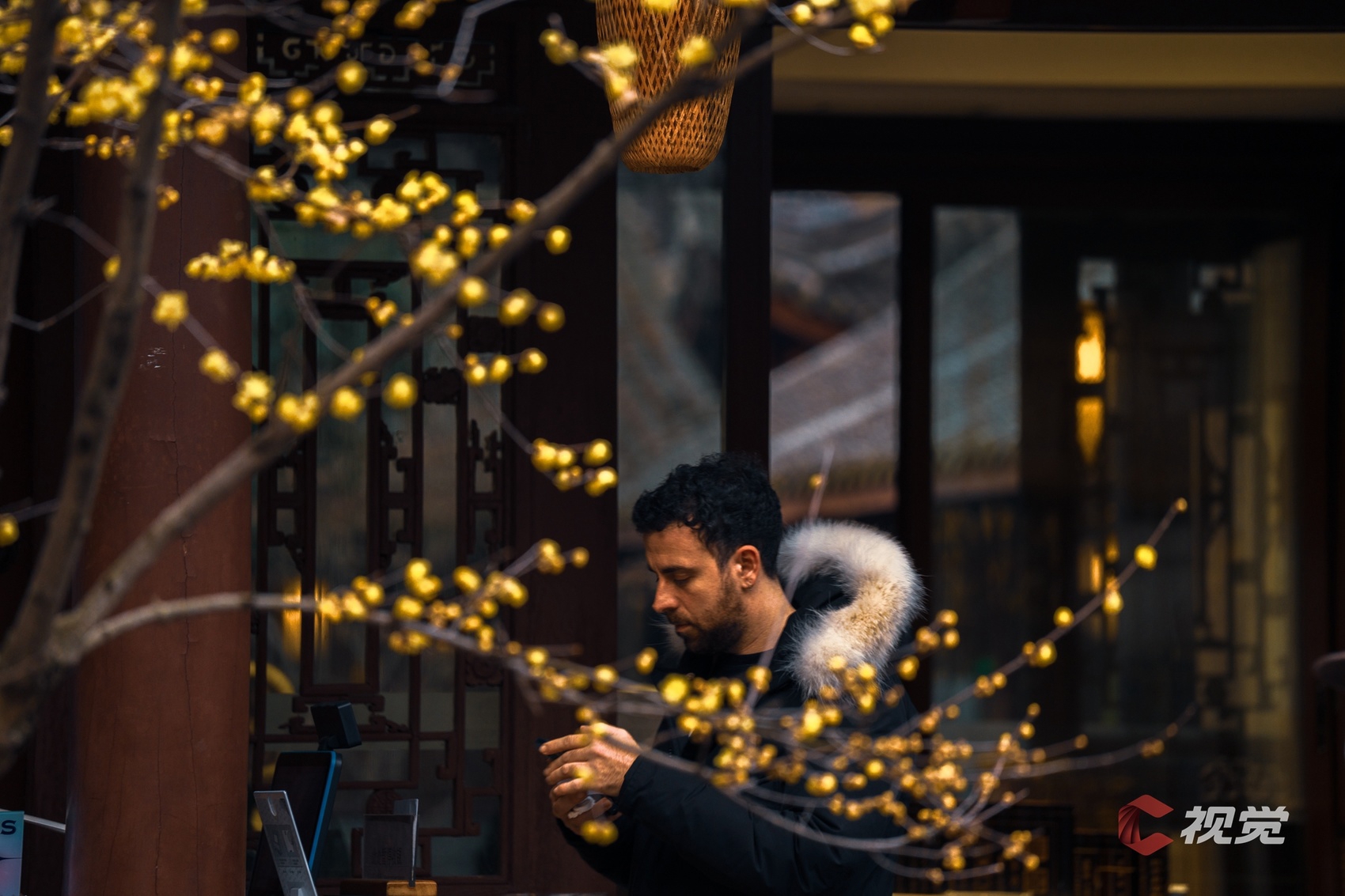 杜甫草堂蜡梅花开吸引了外国游客前来拍照。C视觉摄影师 李佳