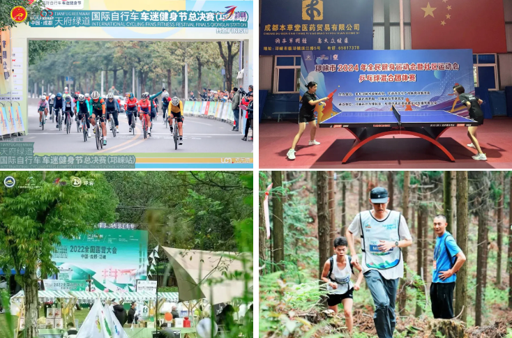 近年来成功举办2024年四川省“最美绿道”系列赛(邛崃站)暨邛崃天台山长征山径赛、2023第二届中国家庭户外挑战赛暨2023年全国露营大会、2023中国·成都天府绿道国际自行车车迷健身节总决赛(邛崃站)、成都市第十届全民健身运动会乒乓球公开赛(邛崃站)等多项大型赛事活动,开展各级各类全民健身活动700余场,全民健身、全民运动的氛围和基础不断夯实。