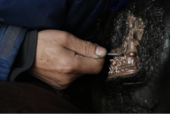 (经验丰富的工匠正在对浇铸成型的利玛铜铜像进行錾刻加工)