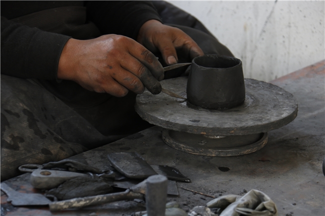 (黑陶工坊里,匠人正在用传承已久的工艺制作器物)