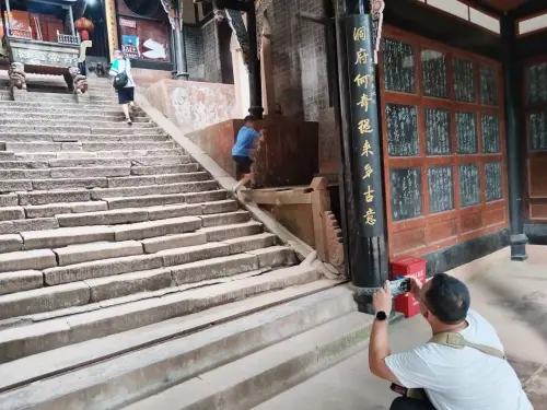 抵达上清宫,海拔1180米,是青城山最高的一座道观。在殿外,有很多游客正打卡拍照。来自上海的罗小美女士是位语文老师,跟着十几人的疗休养团队来都江堰进行一周的疗休养。说起青城山,罗小美饱含深情:“此次慕名而来。因为以前读过余秋雨的《文化苦旅》,其中讲到了青城山,所以非常向往。今天是冒着暑气而来,但进入山里面,就感觉到丝丝凉意,景色非常美,心旷神怡。上清宫非常有历史,这里也是电视剧《西游记》的取景点,把历史和经典相融合,人文体验感更加强烈。”