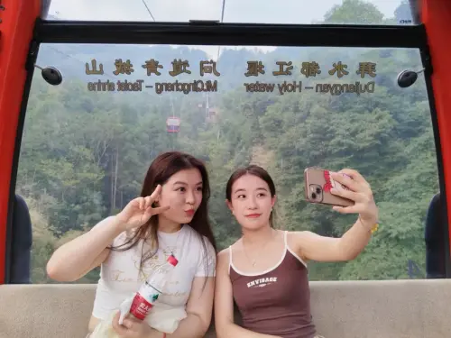 坐游船过月城湖,波光潋滟、群山环抱。再乘坐缆车上到四望观。小玫和梨子是第一次到青城山,从高空俯瞰满山葱郁,更感受到青城山的灵净和静谧,两人连连举起手机自拍,让人物和山色同框。