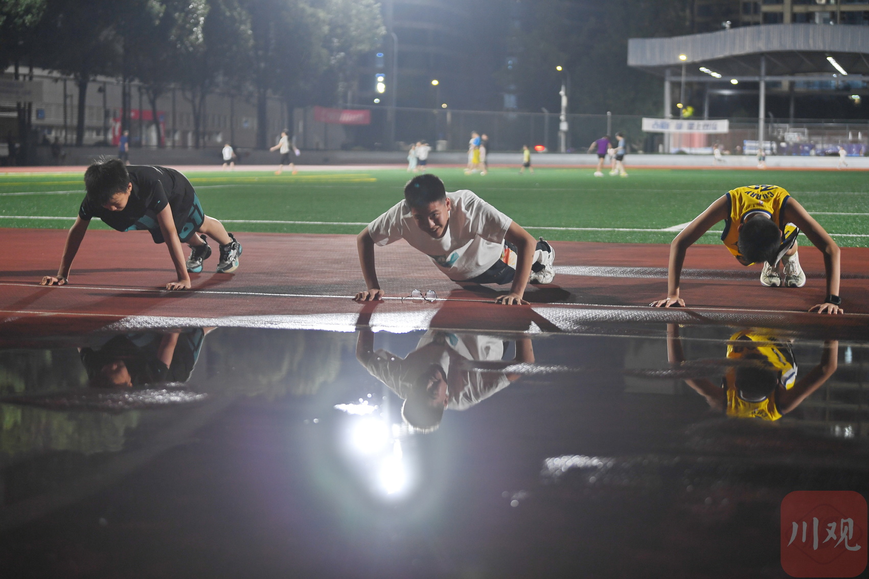 2024年8月9日晚,在成都双流体育中心,三名初中生做俯卧撑。