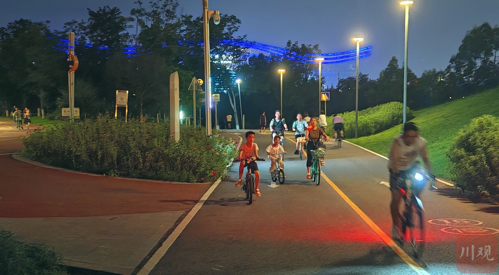 2024年8月10日晚,市民在成都高新区桂溪生态公园绿道上夜间骑行。