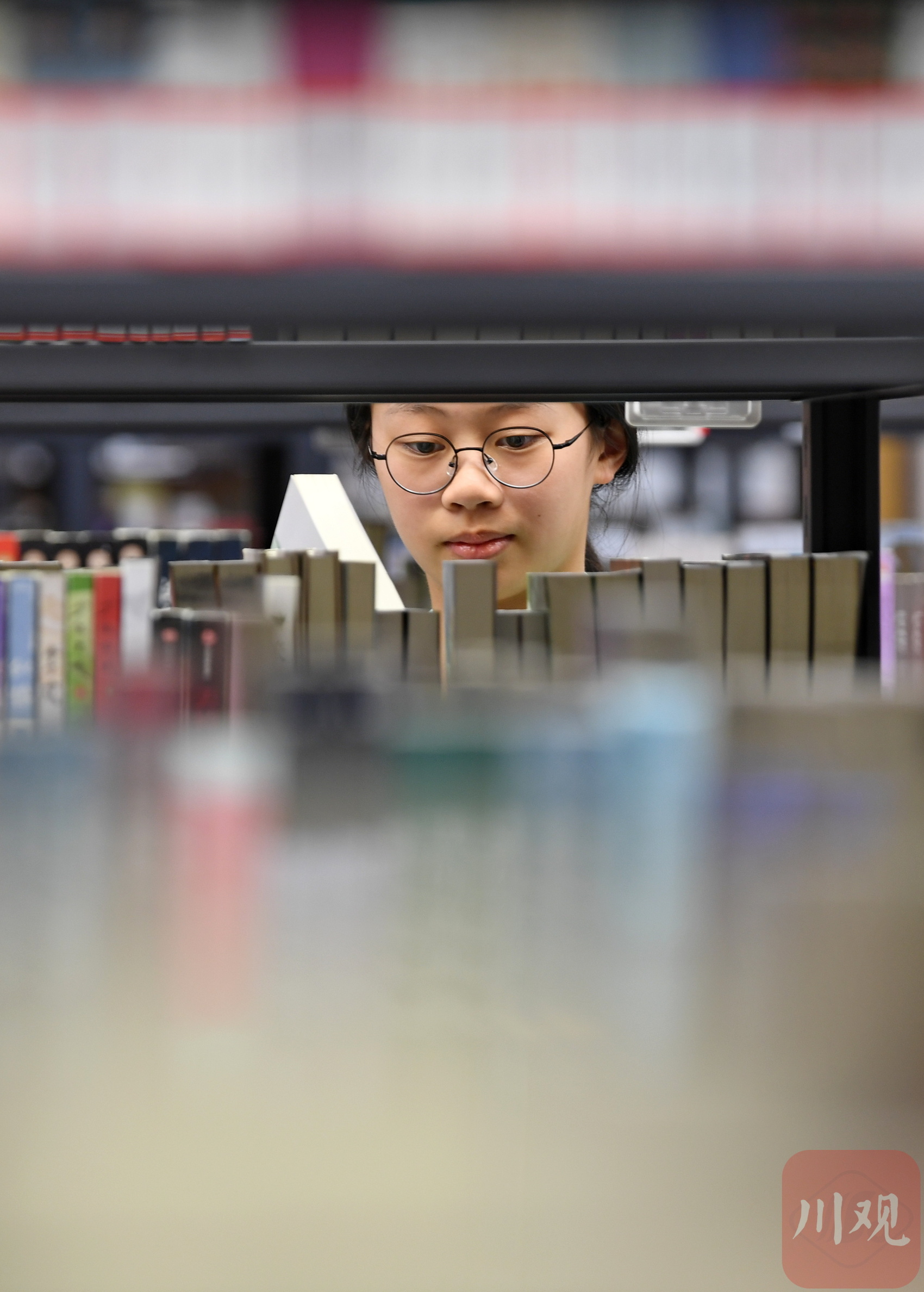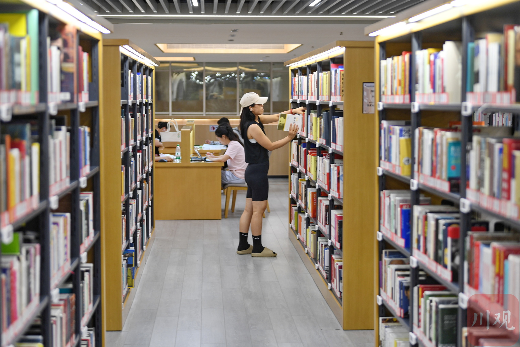 2024年7月28日晚,读者在成都高新区图书馆里寻找自己喜欢的书籍。