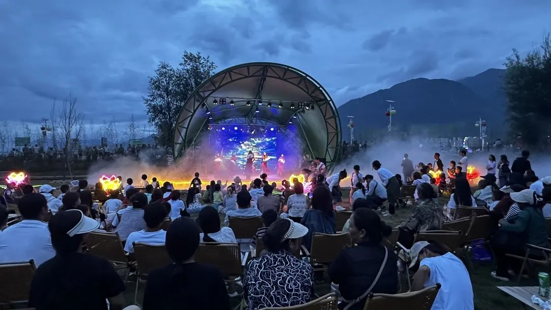 随着夜幕的降临,营地里绚丽的灯光、动听的歌声、美妙的舞蹈,赢得了观众的阵阵掌声。川剧变脸、吐火充满神秘色彩,小丑表演妙趣横生,吸引了现场的小朋友一起互动打卡……