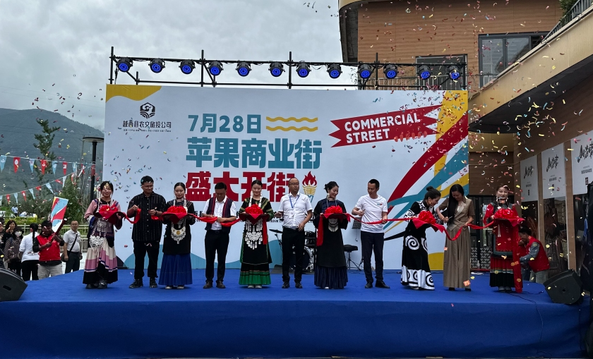 本网讯(记者 高明山 李鹏飞)7月28日,四川凉山彝族自治州越西县水韵花红国家AAAA级旅游景区苹果主题街区举行开街活动。越西县委书记陈路出席活动;县委副书记蒋勇宣布开街; 县委常委、大瑞镇党委书记宋尚智致辞;县国投公司、四川省农小云供应链管理有限公司、凉山链融供应链管理有限公司、凉山州新华书店有限责任公司越西分公司、越西甬城文旅山海情非遗工坊负责人共同剪彩。