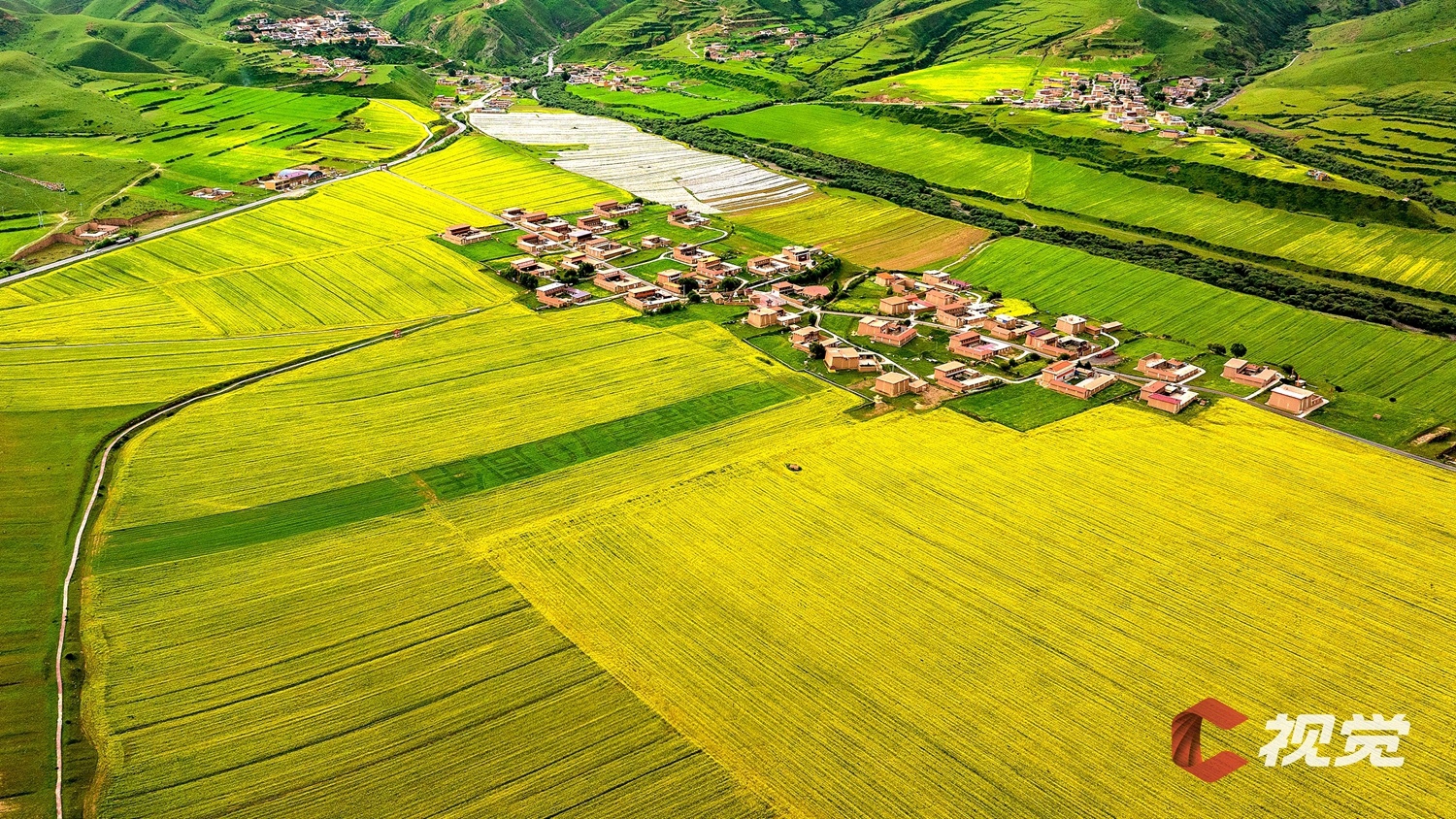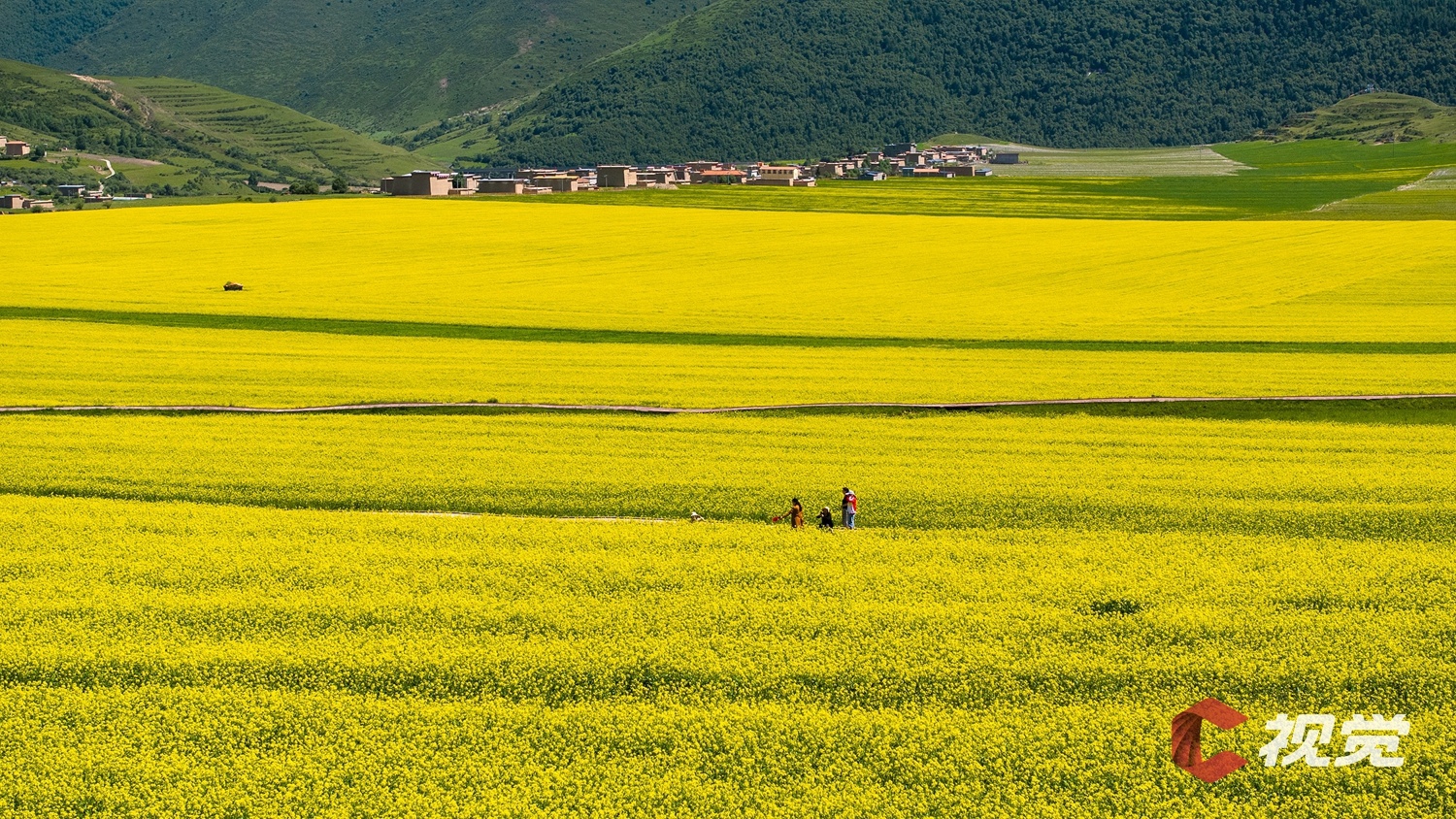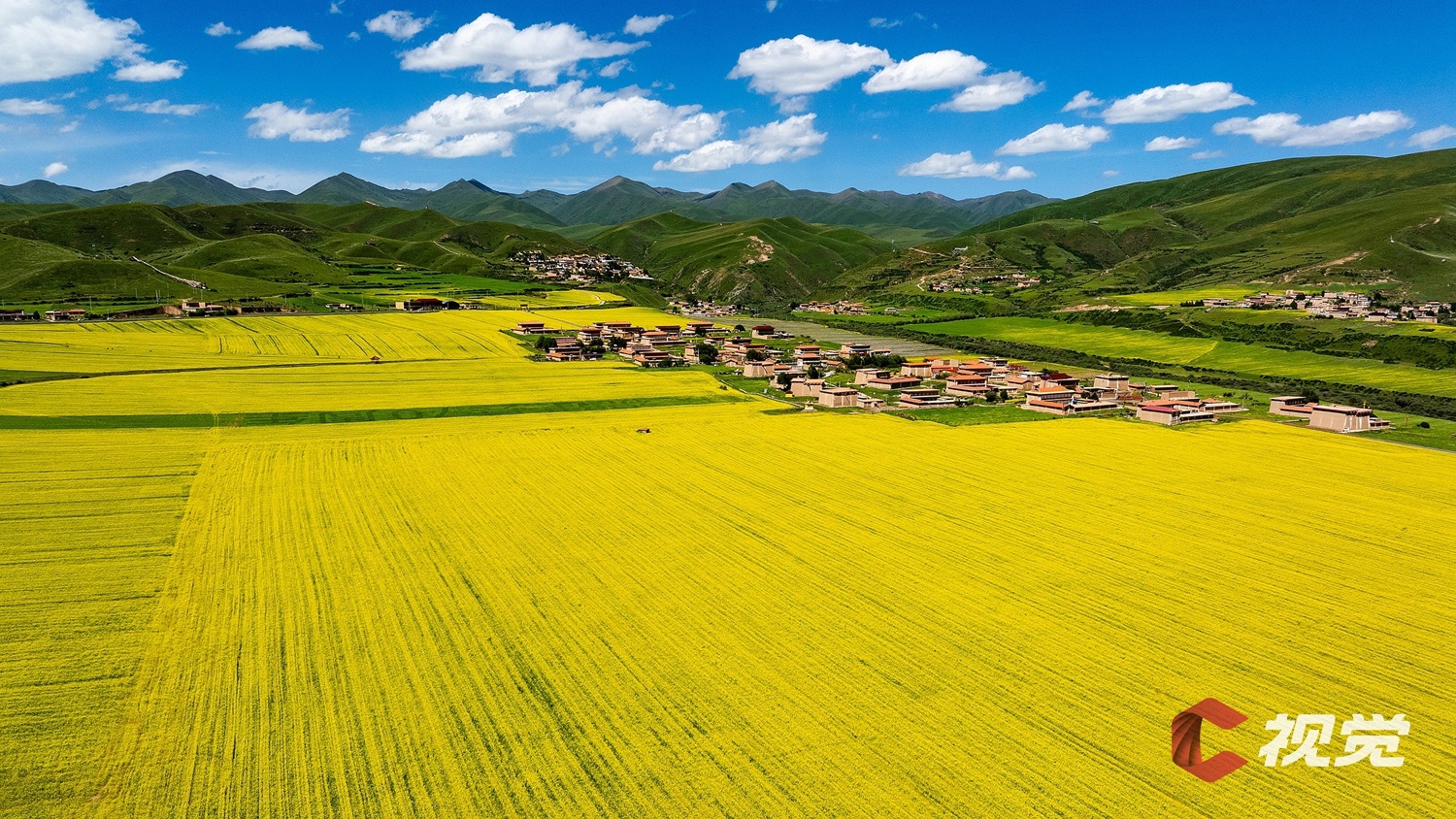 阿坝县坝上农耕生态旅游景区,上万亩油菜花田迎来盛花期。