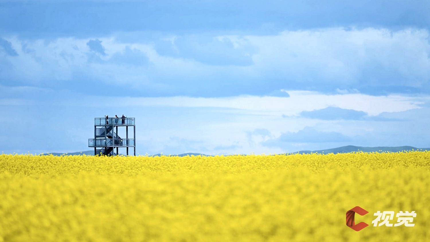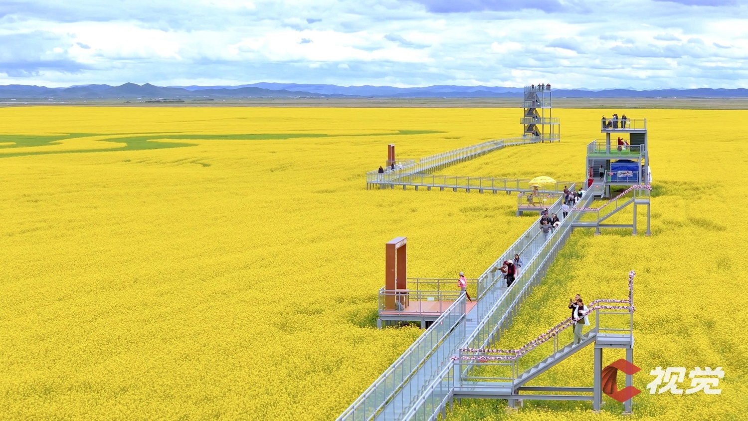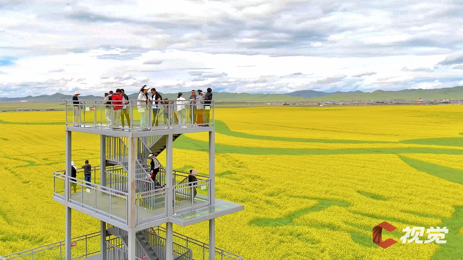 游客登上观光台,眺望若尔盖县唐克镇的油菜花海。