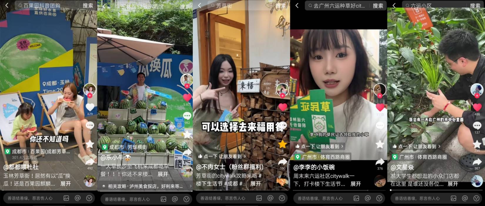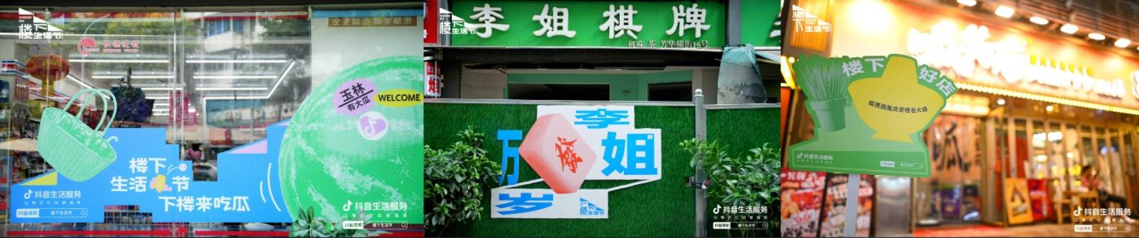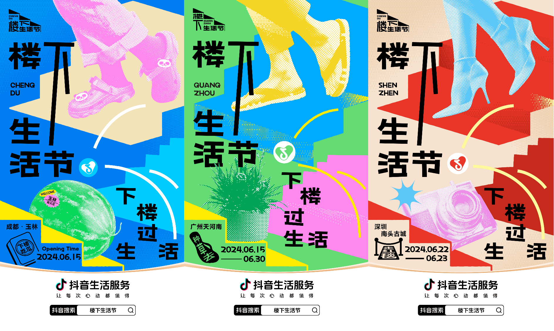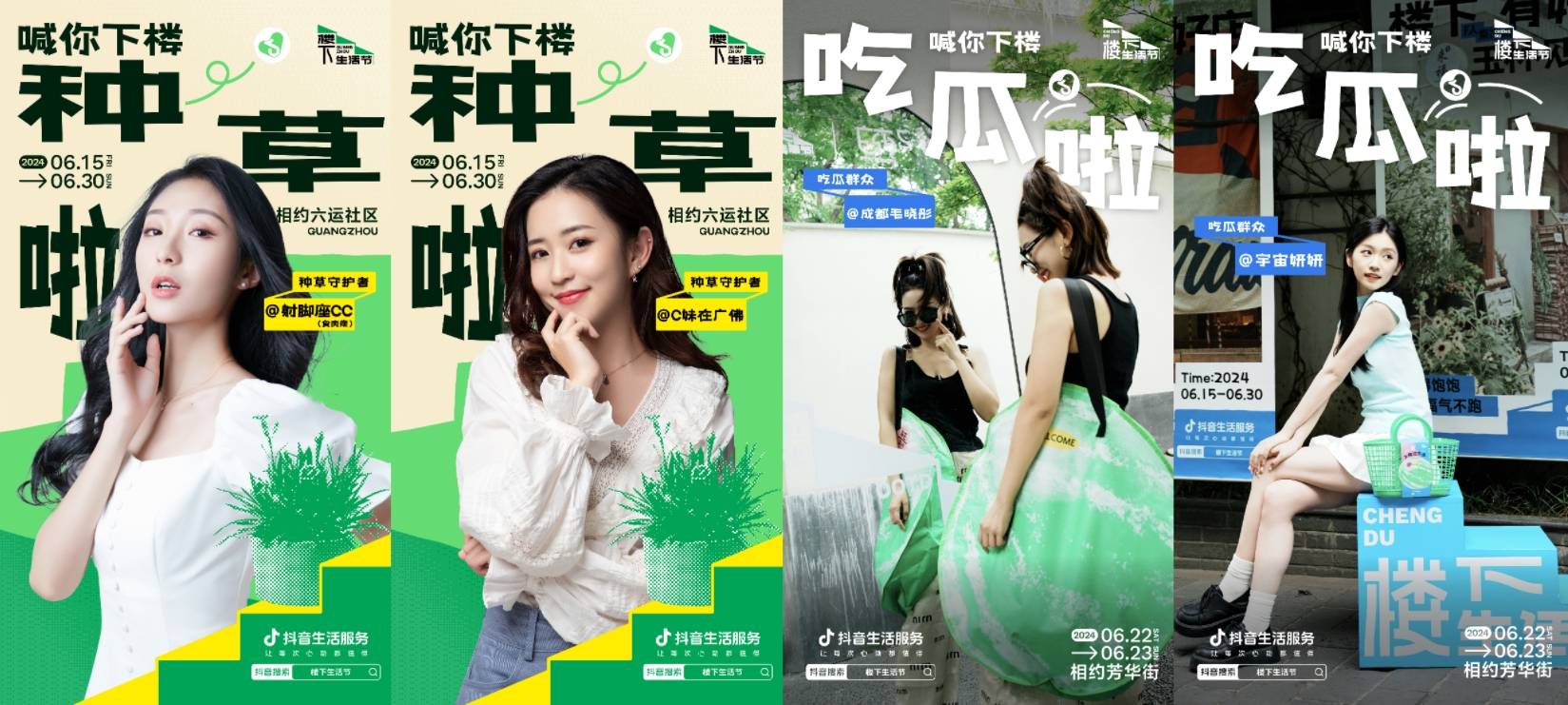 活动期间,在3地政府支持下,抖音生活服务联动3个城市的社区、街店、达人,根据城市中不同的社区文化,分别在成都玉林、广州天河南和深圳南头古城,为生活在此地的人们,定制化打造“下楼·吃个瓜”、“下楼·种棵草”、“下楼·走场show”3大主题活动,用一场特别的「楼下生活节」,为夏日楼下生活再添上一份美好。