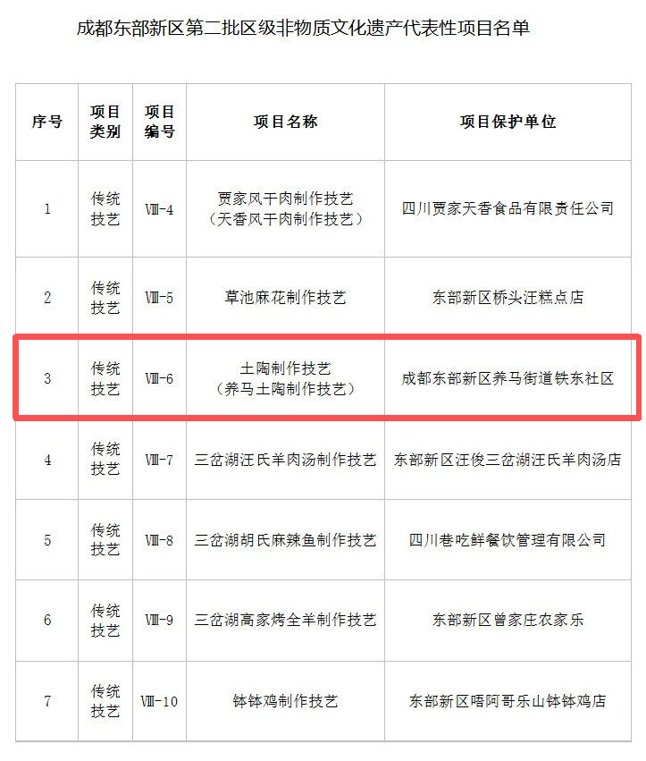 为全面贯彻落实《中华人民共和国非物质文化遗产法》《四川省非物质文化遗产条例》,加强成都东部新区非物质文化遗产保护与传承。近日,成都东部新区第二批区级非物质文化遗产代表性项目名单,正式公布。养马街道铁东社区报送的土陶制作技艺(养马土陶制作技艺)以其深厚的历史文化脉络成功入选。